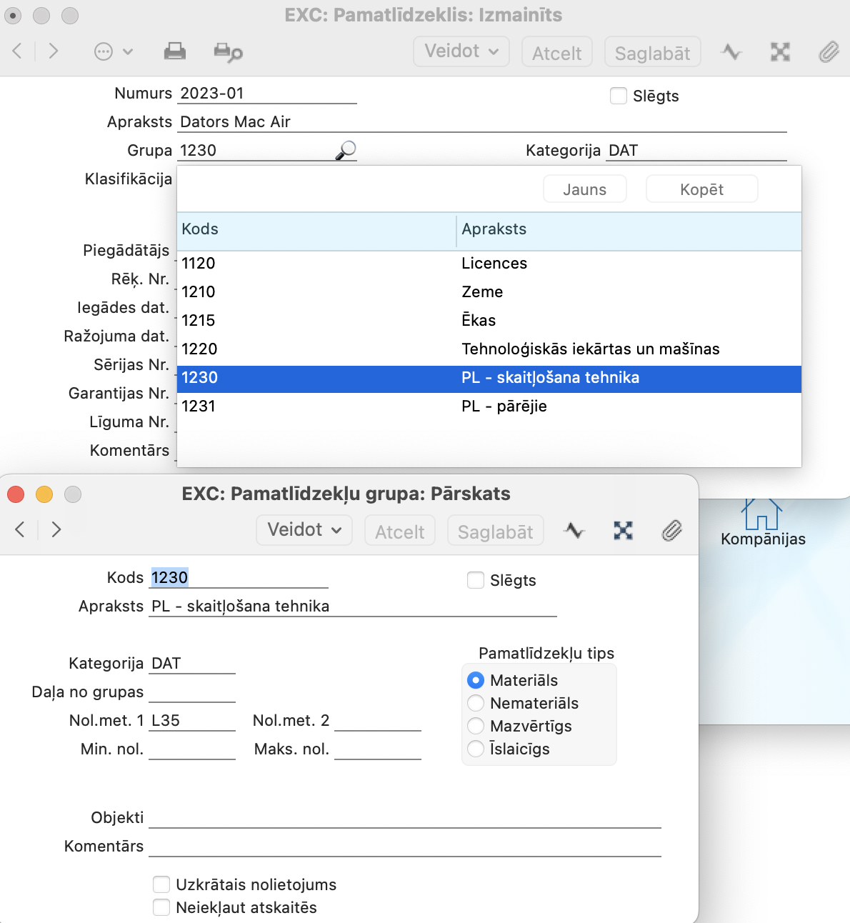 - Pamatlīdzekļu grupu kartītēs var norādīt, kā tās tiks atspoguļotas atskaitēs.