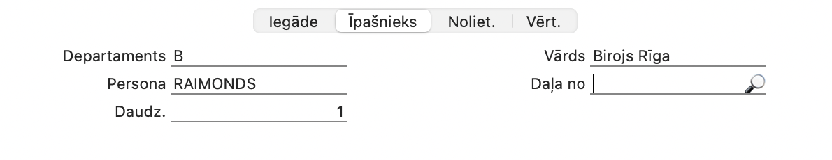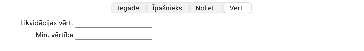 Ja kartītes sadaļā “Īpašnieks” daudzums ir lielāks par vienu, šajā laukā jāiekļauj iegādes vērtību par vienu vienību, nevis kopējā iegādes vērtība.