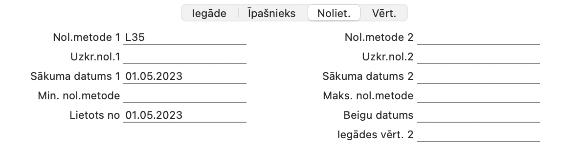 Nolietojuma metode 2 izmanto “Iegādes vērtību 2”, neskaitot PVN, kā pamats nolietojuma aprēķināšanai. Ja atstāsiet šo lauku tukšu, tas izmantos lauku “Iegādes vērtība” no sadaļas “Iegāde”. Otrajā nolietojuma metodē nolietojums netiks aprēķināts, ja gan šis lauks, gan “Iegādes vērtība” ir tukši.