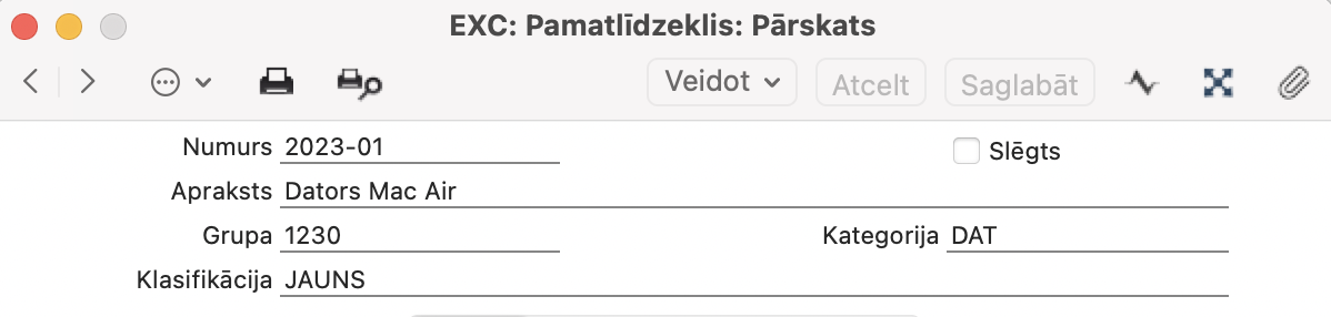 Pamatlīdzekļa ieraksta logā ir četras sadaļas ar vienu kopīgu galveni. Tā sastāv no laukiem: Numurs, Slēgts, Apraksts, Grupa, Klasifikācija un Kategorija. Galvenē ir četras nosauktas cilnes.