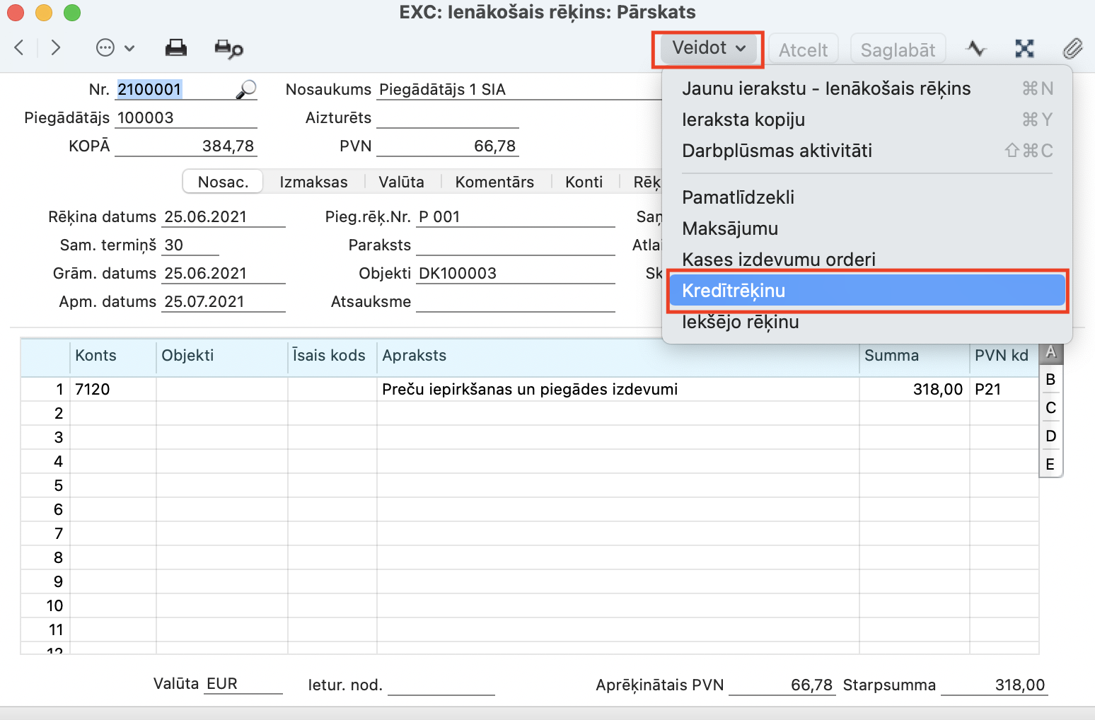 1. Piegādātāji > Reģistri > Ienākošie rēķini atveriet nepareizi ievadīto Ienākošo rēķinu un izvēlnē Veidot izvēlieties “Kredītrēķinu”.
