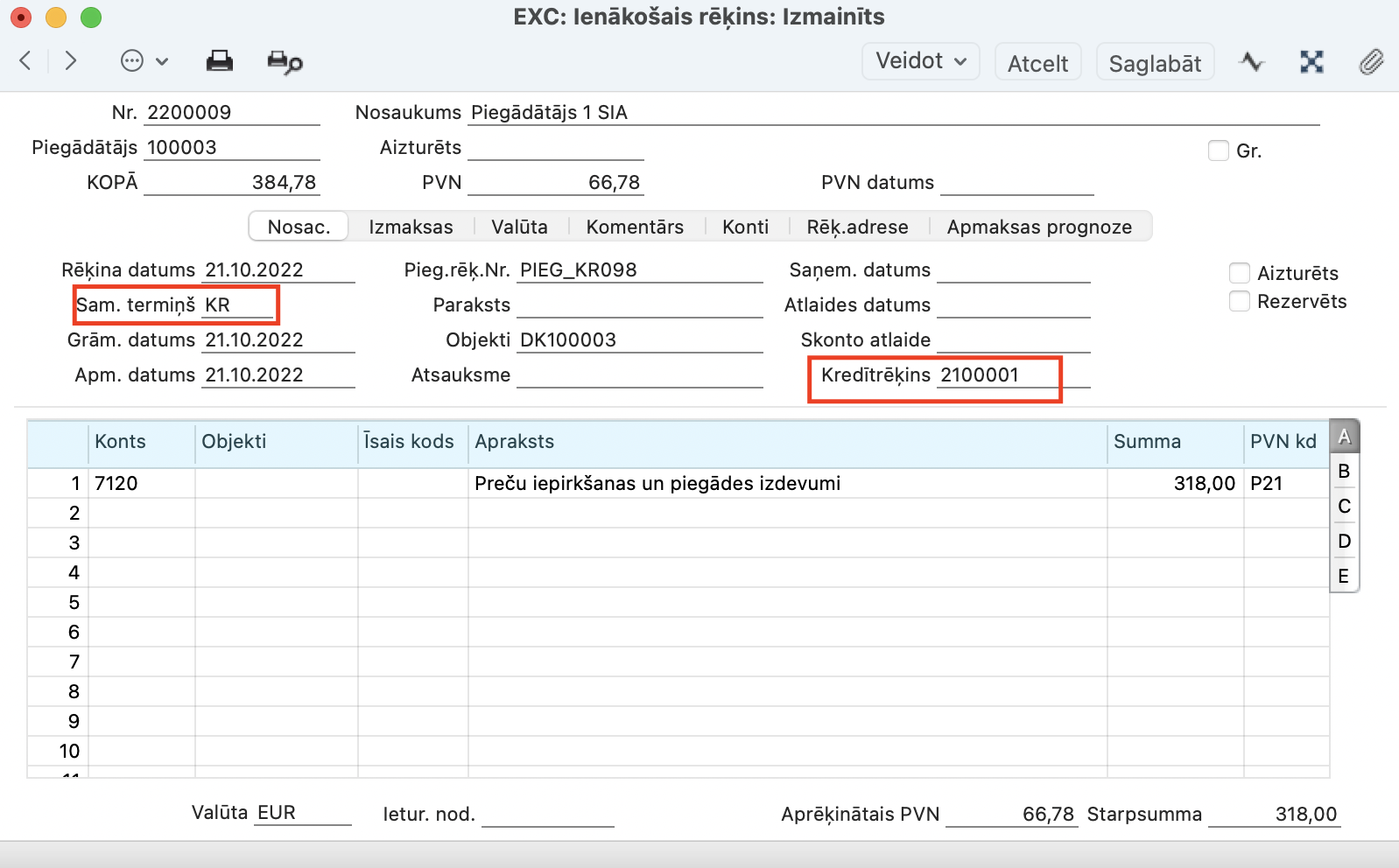 Atvērsies jauns Ienākoša rēķina ieraksts, kurā samaksas termiņš ir KR (kredītrēķina tips) un lauks “Kredītrēķins” – tiks aizpildīts ar kreditējamā rēķina numuru.