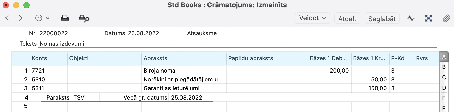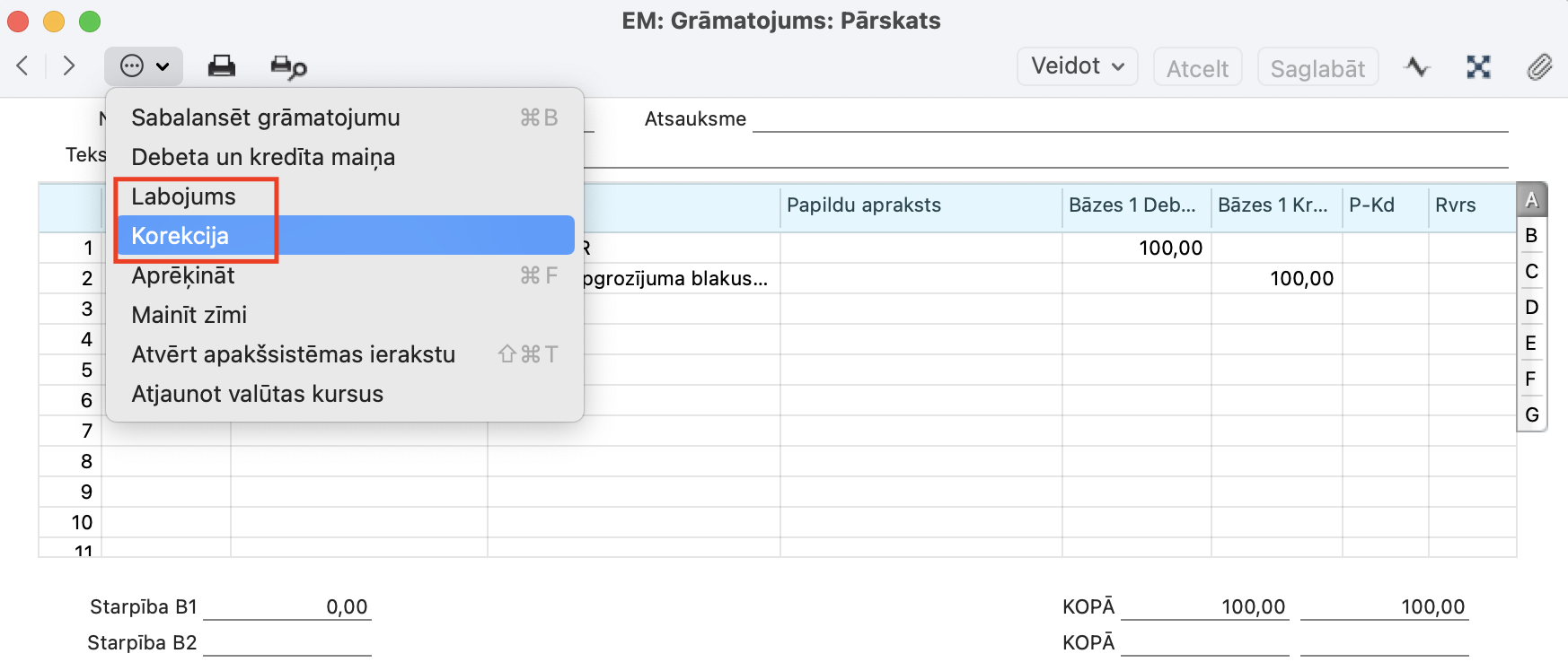 2. Darbību izvēlnē izvēlieties “Debeta un kredīta maiņa”. Šādā veidā tiek mainītas ieraksta rindas (kredīta summas tiks pārveidotas par debeta summām un otrādi). Šādā veidā nepareizais ieraksts tiek atcelts.