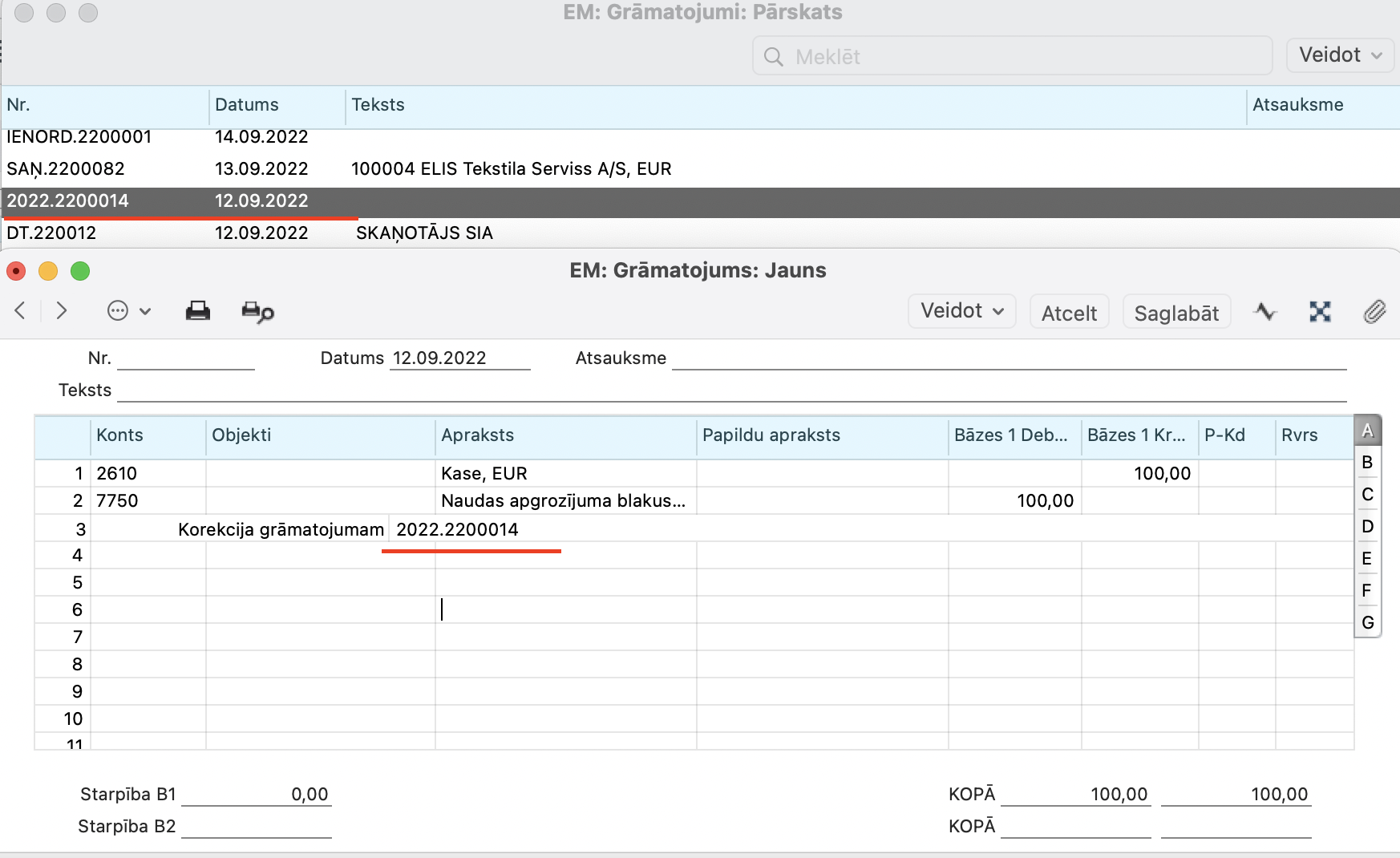 3. Ja kļūda ir ieraksta galvenē nevis rindās (piemēram, ieraksta datums nav pareizs), tad varat to labot izmantojot labojuma atzīmi. Izvēlieties “Labojums” un izmainiet datumu atbilstoši nepieciešamībai.