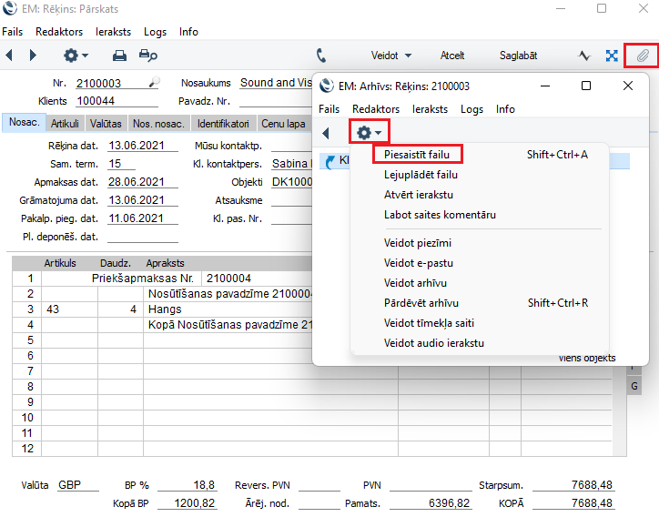 1. Lai pievienotu failu, klikšķinot uz saspraudes ikonas, atveriet arhīvu un Darbību izvēlnē izvēlieties “Piesaistīt failu”. Atvērsies logs, kurā varēsiet norādīt tā faila atrašanās vietu, kuru vēlies pievienot.
