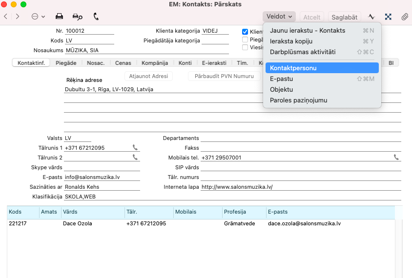 Pirms tam kontakta kartītē ir jābūt pievienotām kontaktpersonām. Tās var pievienot izvēloties Veidot – kontaktpersonu.