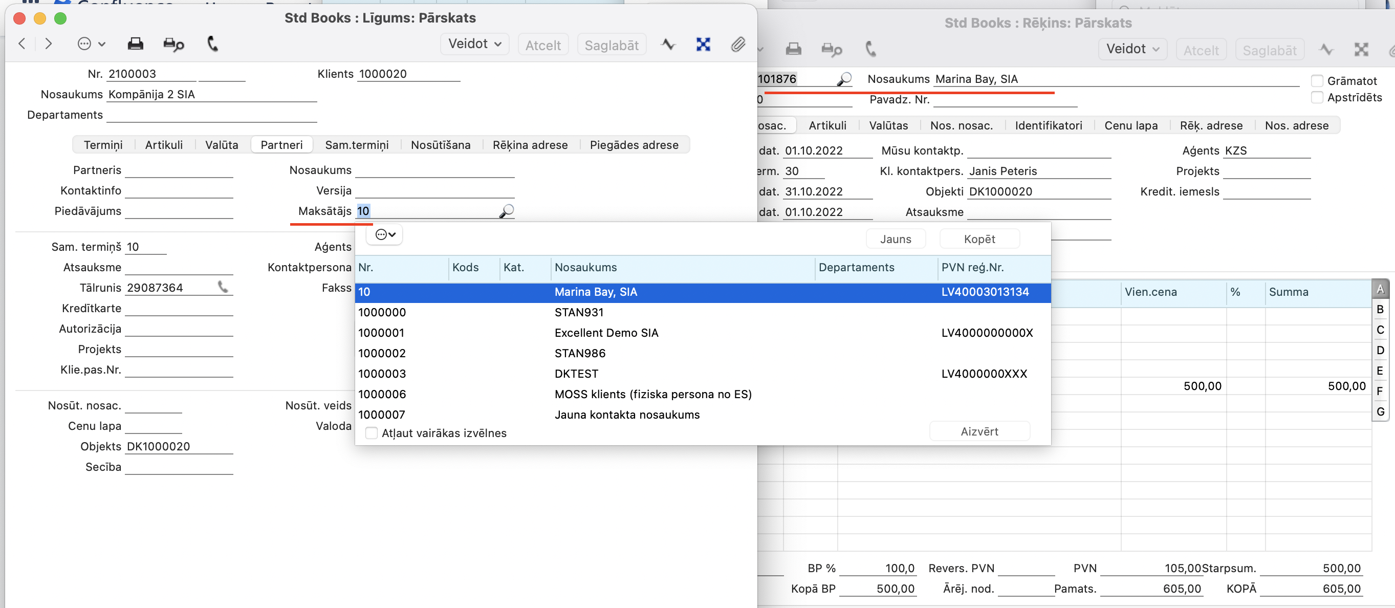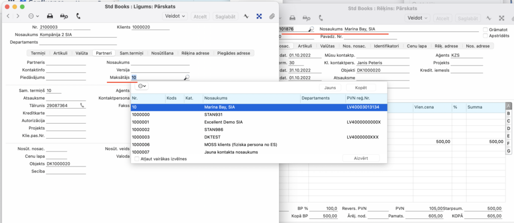 Pēc tam modulī Norēķini pēc līgumiem > Reģistri > Līgumi > Veidojot līgumu Kontaktam (piem. 1000020 -Kompānija 2 SIA) > sistēma automātiski aizpildīs lauku “Maksātājs” sadaļā “Partneri”.