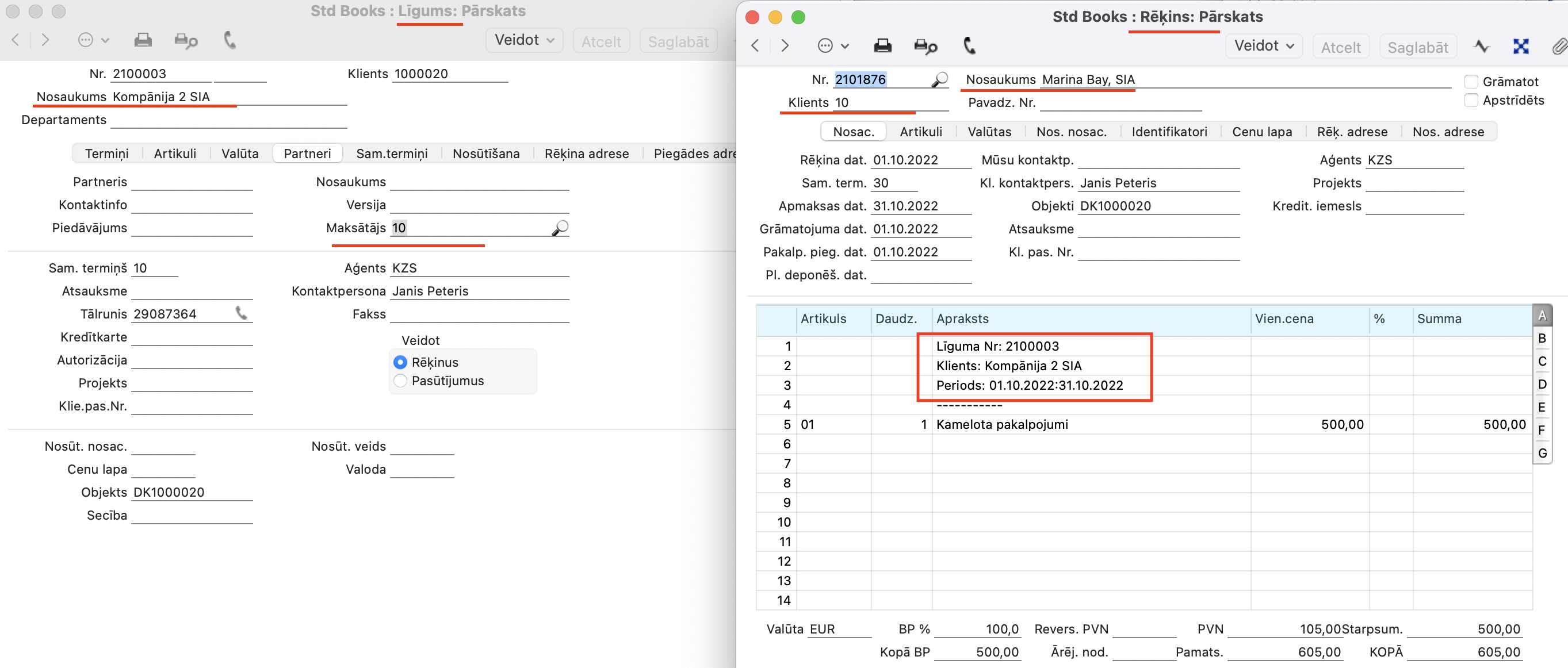 Veidojot rēķinu šīm līgumam izmantojot moduli Norēķini pēc līgumiem > Rutīnas > Apkalpošana > Veidot līgumu rēķinus > tiks izveidots rēķins “Maksātājam” Vairāk par moduli Norēķini par līgumiem lasiet ŠEIT.