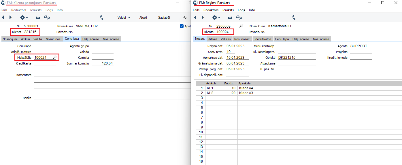 Tad no Klienta pasūtījuma izvēloties “Veidot – Rēķinu”, uz Rēķina jau automātiski laukā “Klients” būs ievietots maksātāja numurs.