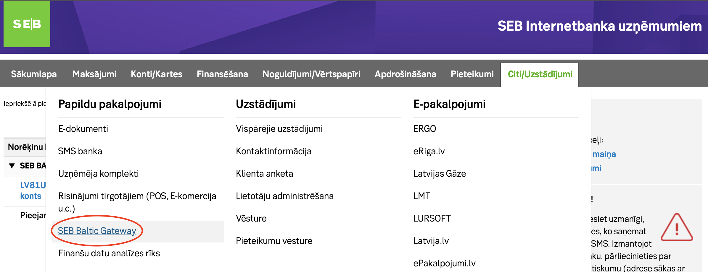 SEB internetbankā zem sadaļas Citi/Uzstādījumi > SEB Baltic Gateway > jāizvēlas operatora pieslēgums un kā operatoru jānorāda Excellent Latvia SIA.