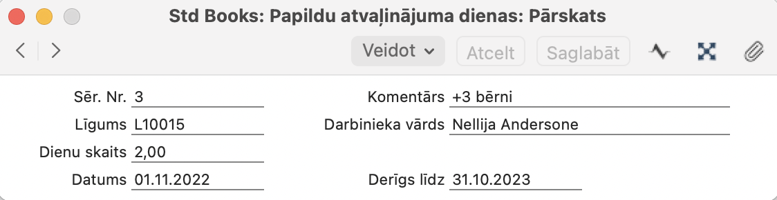 Veidojot atvaļinājuma prombūtnes ierakstu un algu aprēķinu, programma automātiski norakstīs papildu atvaļinājuma dienas kā pirmās un pēc tam sāks norakstīt ikgadējas atvaļinājuma dienas.