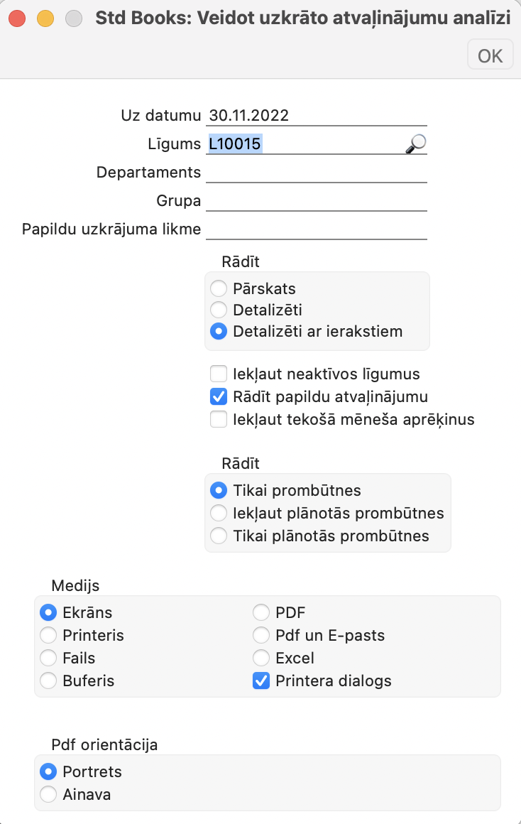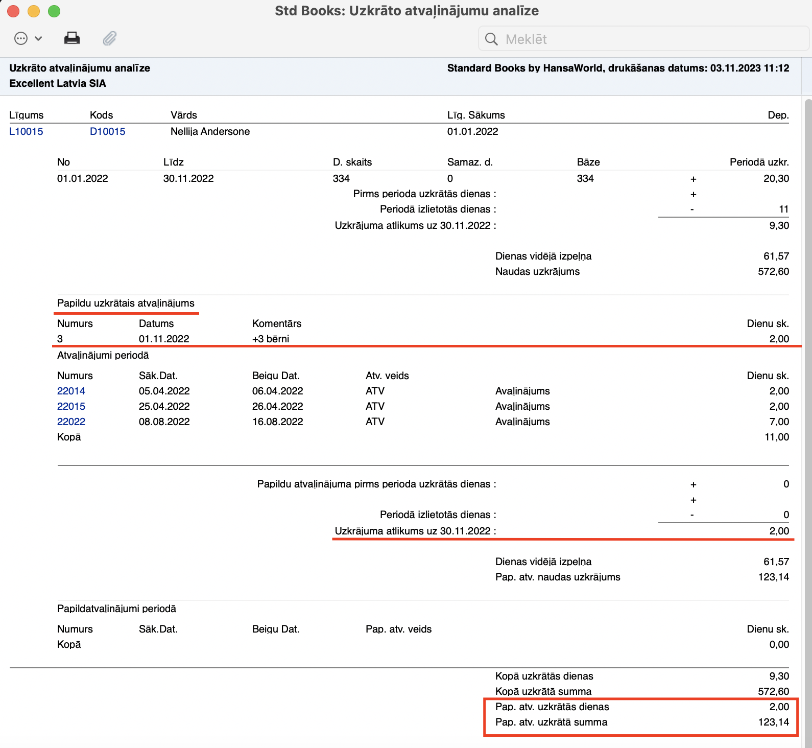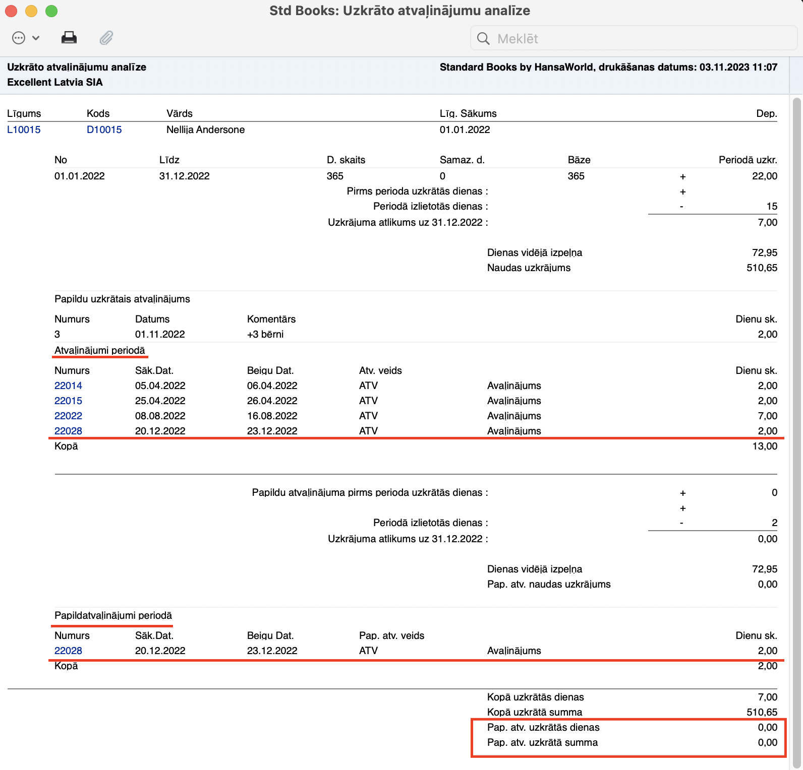 Atskaite “Uzkrāto atvaļinājumu analīze” uz 30.11.2022 izskatīsies šādi, ja mēs to palaidīsim ar sekojošiem parametriem: