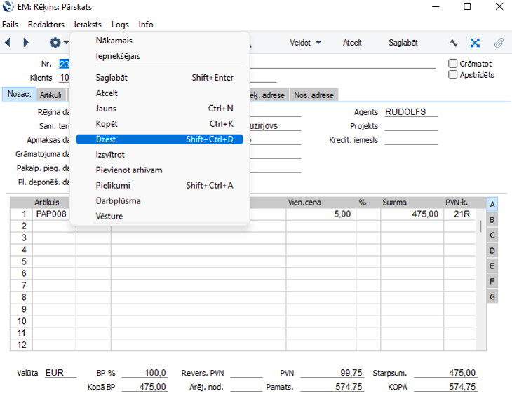 Lai izdzēstu ierakstu, tas ir jāatver un “Ieraksta” izvēlnē ir jāizvēlas Dzēst. Ierakstus, ar kuriem jau ir veiktas darbības (piem. Grāmatot, Apstiprināt), izdzēst nevar.