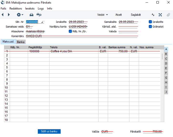 Šo funkciju var izmantot Rēķina vai Maksājuma uzdevuma ierakstu logā (Ieraksts > Izsvītrot), kad nepieciešams izņemt Rēķinu no Realizācijas moduļa vai Maksājumu no Piegādātāju moduļa. Jebkurš saistītais grāmatojums tiks noņemts arī no moduļa Finanses. Kā parādīts tālāk, izsvītroto rēķinu var viegli atšķirt, jo pār visiem laukiem ir novilktas sarkanas līnijas.