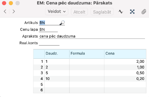 Piemēram, ja norādāt, ka sākot ar daudzumu 5 cena būs 0.50 eur, bet sākot no 10 gab. – 0.20 eur, tad, izrakstot rēķinu ar daudzumu 7, programmatūra ņems vērā vienības cenu, kas atbilst intervālam 5 – 9 (0.50 eur).