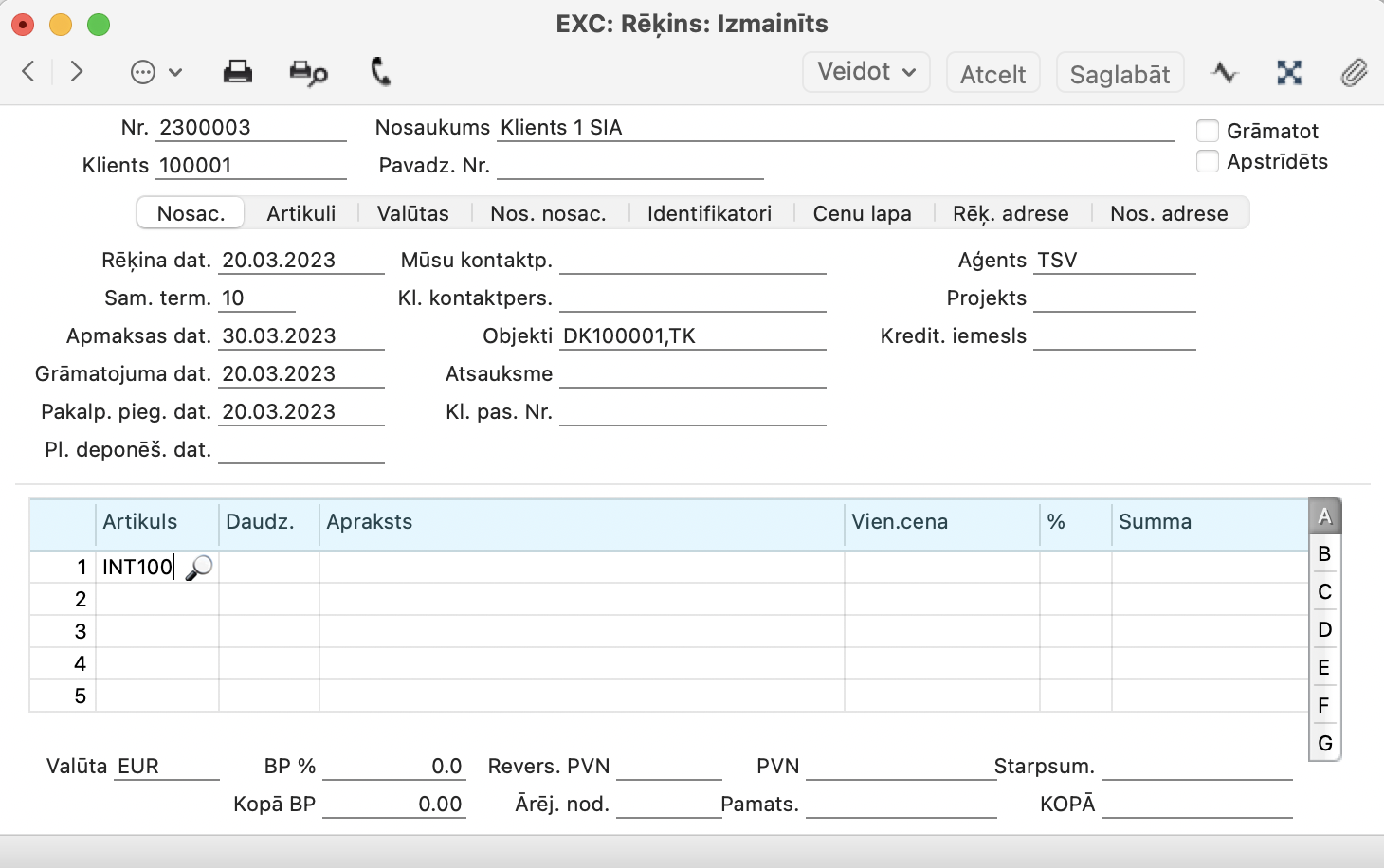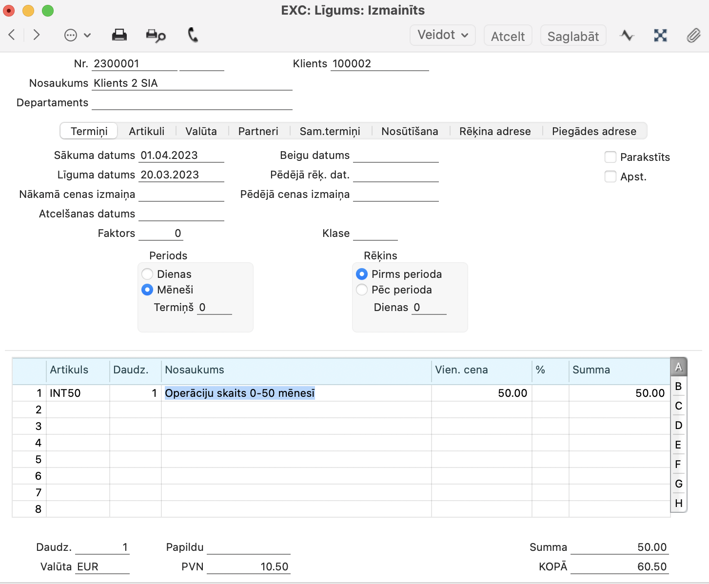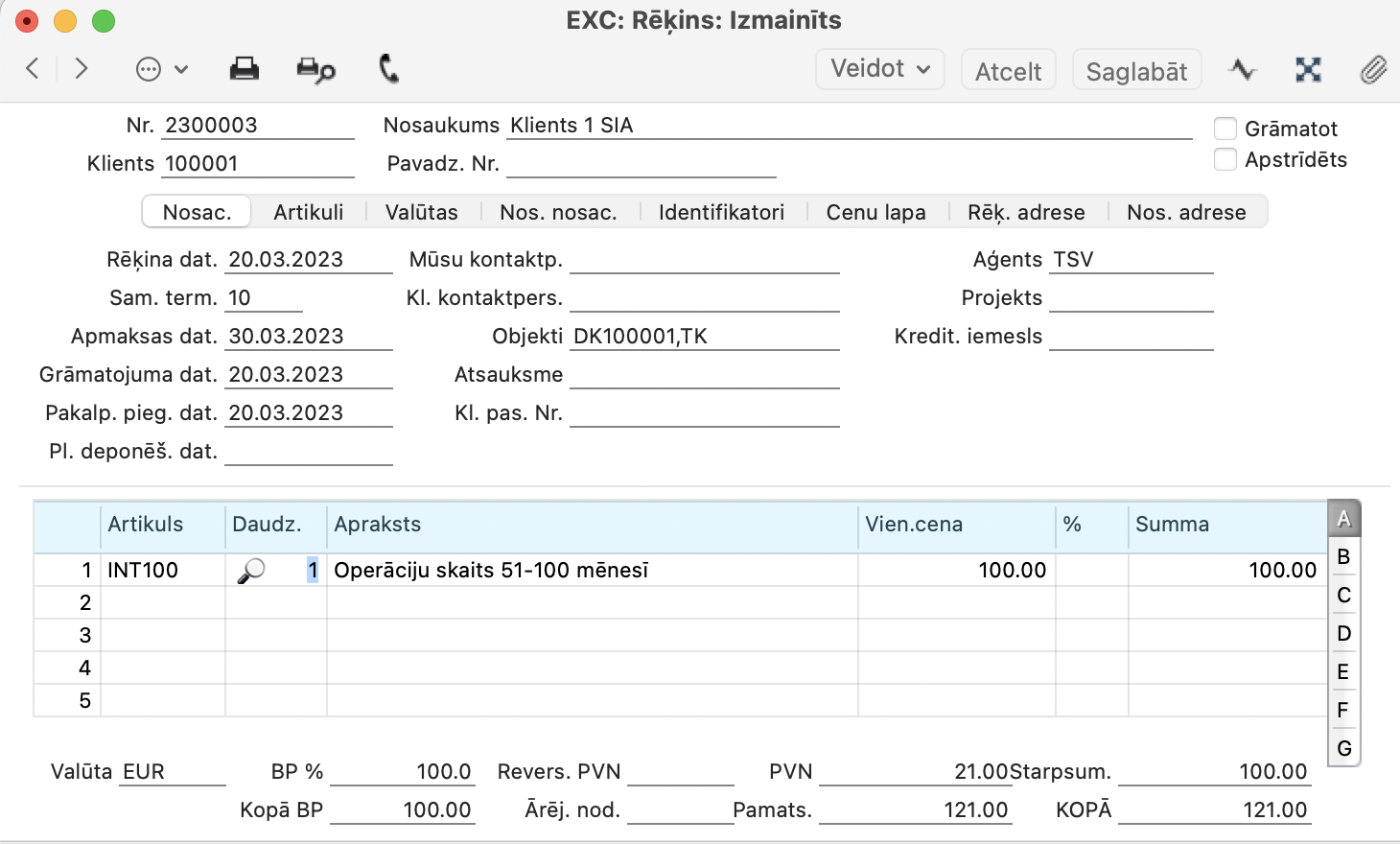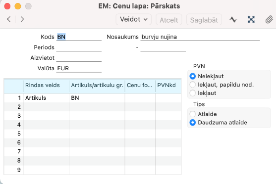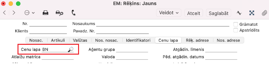 NB! Kad iestatījums ir saglabāts, tad izrakstot rēķinu sadaļā “Cenu lapa”, laukā “Cenu lapa” ir jābūt ievietotai izveidotajai cenu lapai.