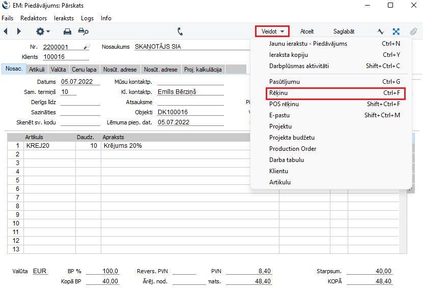 Lai izveidotu realizācijas rēķinu, dodieties uz moduli Pārdošanas vadība > reģistrs Piedāvājumi > izvēlnē Veidot izvēlieties Rēķinu.