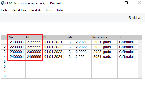 Ja rēķins uzreiz neatveras, tad Realizācijas modulī pārbaudiet iestatījumu Numuru sērijas – rēķini. Norādīto numuru diapazons var būt pilns. Palieliniet “līdz” skaitli.