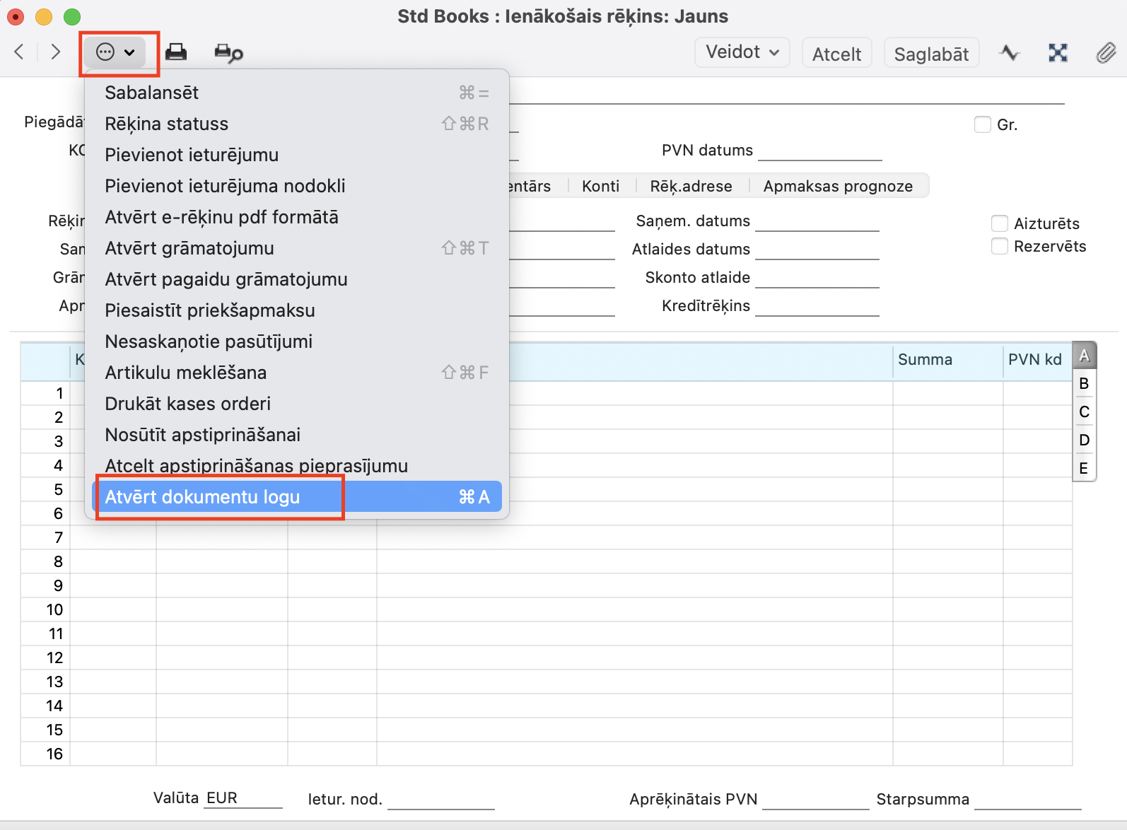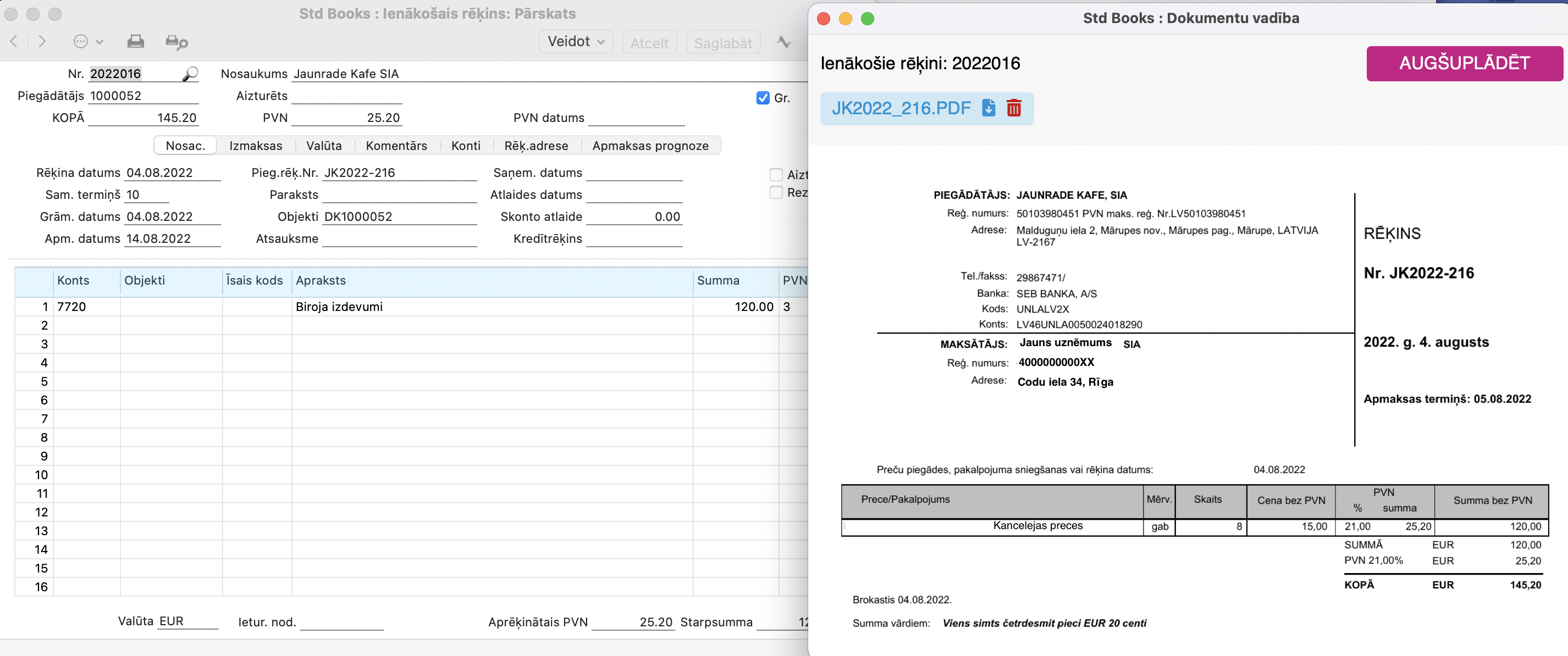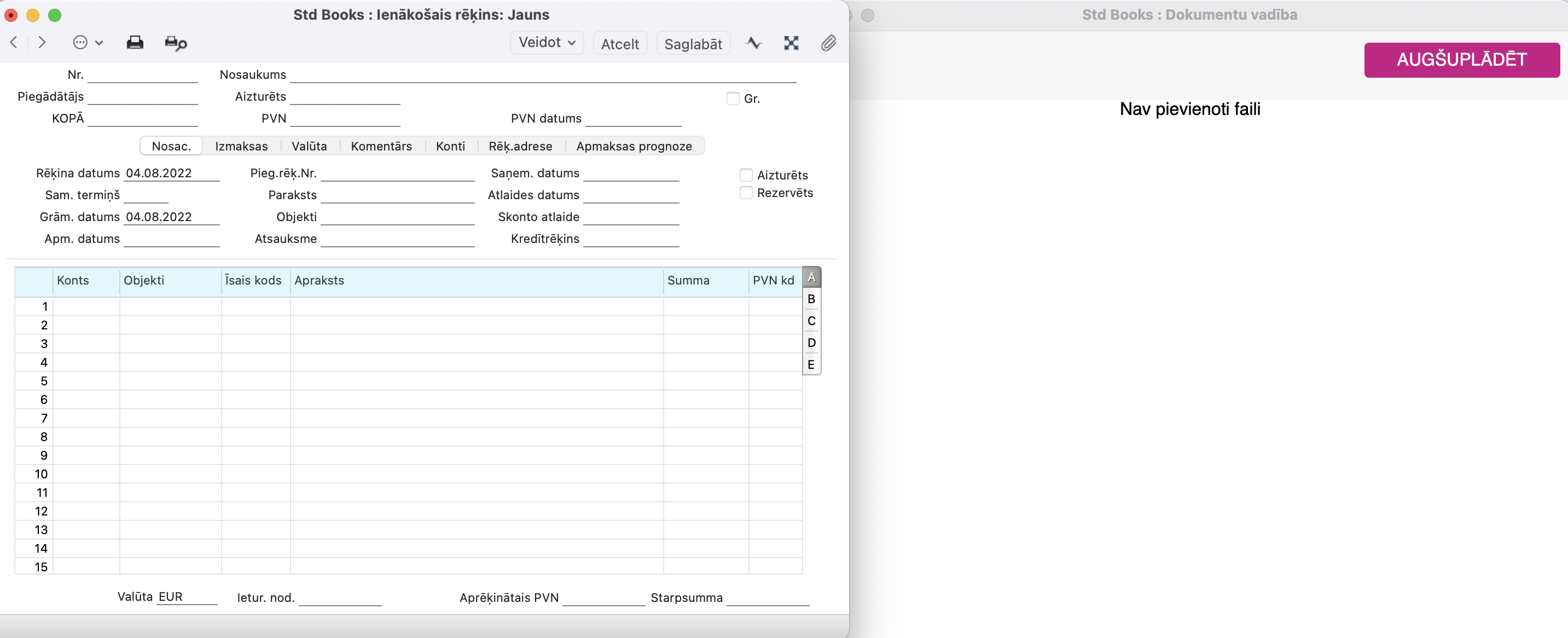 Sākot ar versiju 8.5 2022-04-16-0339 ir pieejama Dokumentu vadības funkcionalitāte, kas dod iespēju lietotājam vienlaicīgi turēt atvērtus Standard Books sistēmas ierakstus (piemēram, ienākošie e-rēķini, realizācijas rēķini, avansa norēķini) un oriģinālā rēķina/čeka elektronisko versiju (piem. PDF, JPG, PNG formātos).