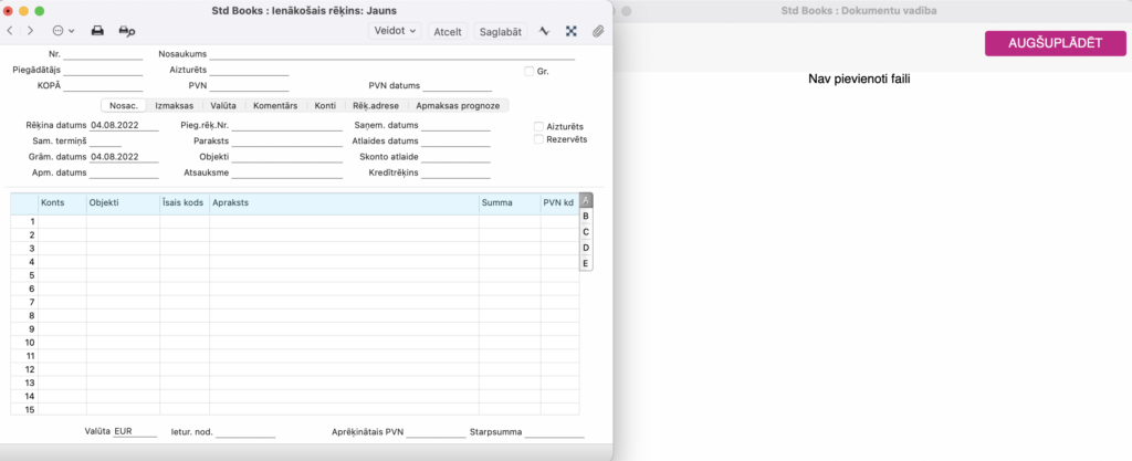 Ar jauna Ienākošā rēķina ierakstu uzreiz parādās Dokumentu Vadības logs, kurā iespējams augšuplādēt pielikumus (piemēram, rēķinu PDF formātā).
