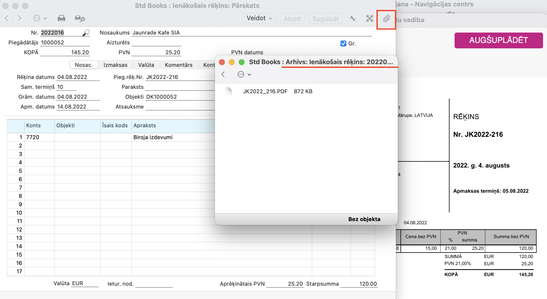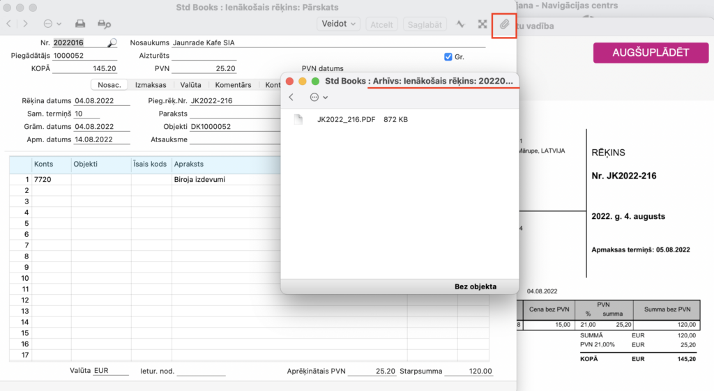 Augšuplādējot rēķina PDF pa tiešo Dokumentu vadības logā, tas ļauj vieglāk aizpildīt Ienākošā rēķina ierakstu. Pēc ieraksta saglabāšanas sistēmā automātiski saglabās pielikumu zem izveidota ieraksta Arhīvā (zem sasspraudes).