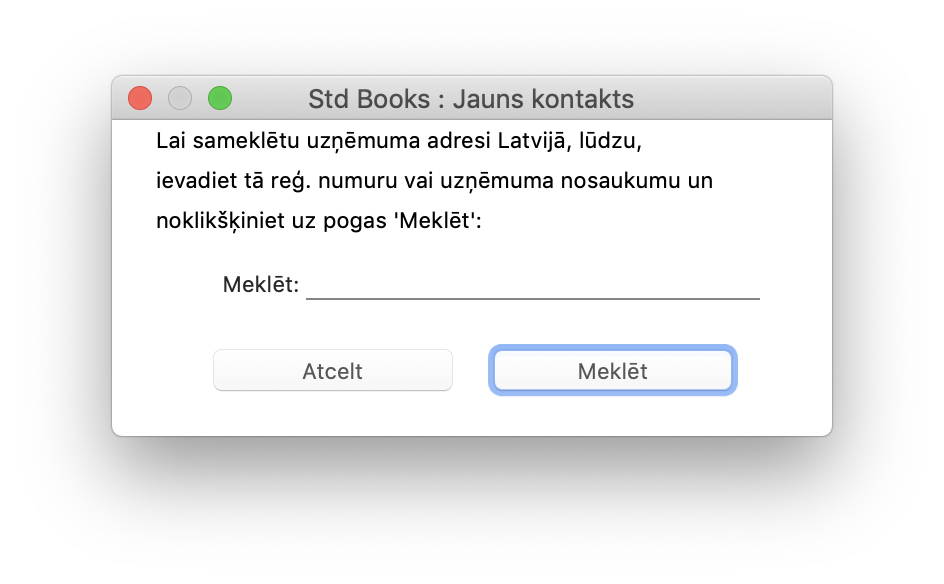 Veidojot jaunu kontakta ierakstu tiek atvērts logs, kurā varat norādīt zināmo informāciju (piemēram, reģistrācijas numurs vai nosaukuma daļa) un dati no Lursoft datu bāzes automātiski tiks norādīti kontakta ierakstā.