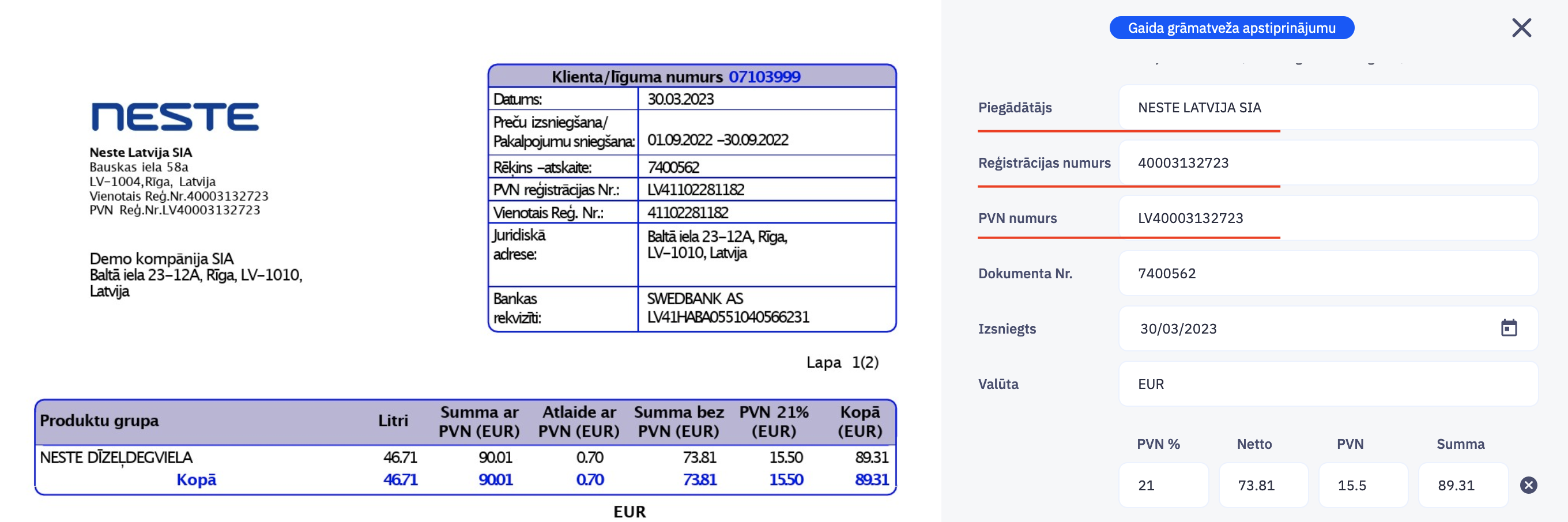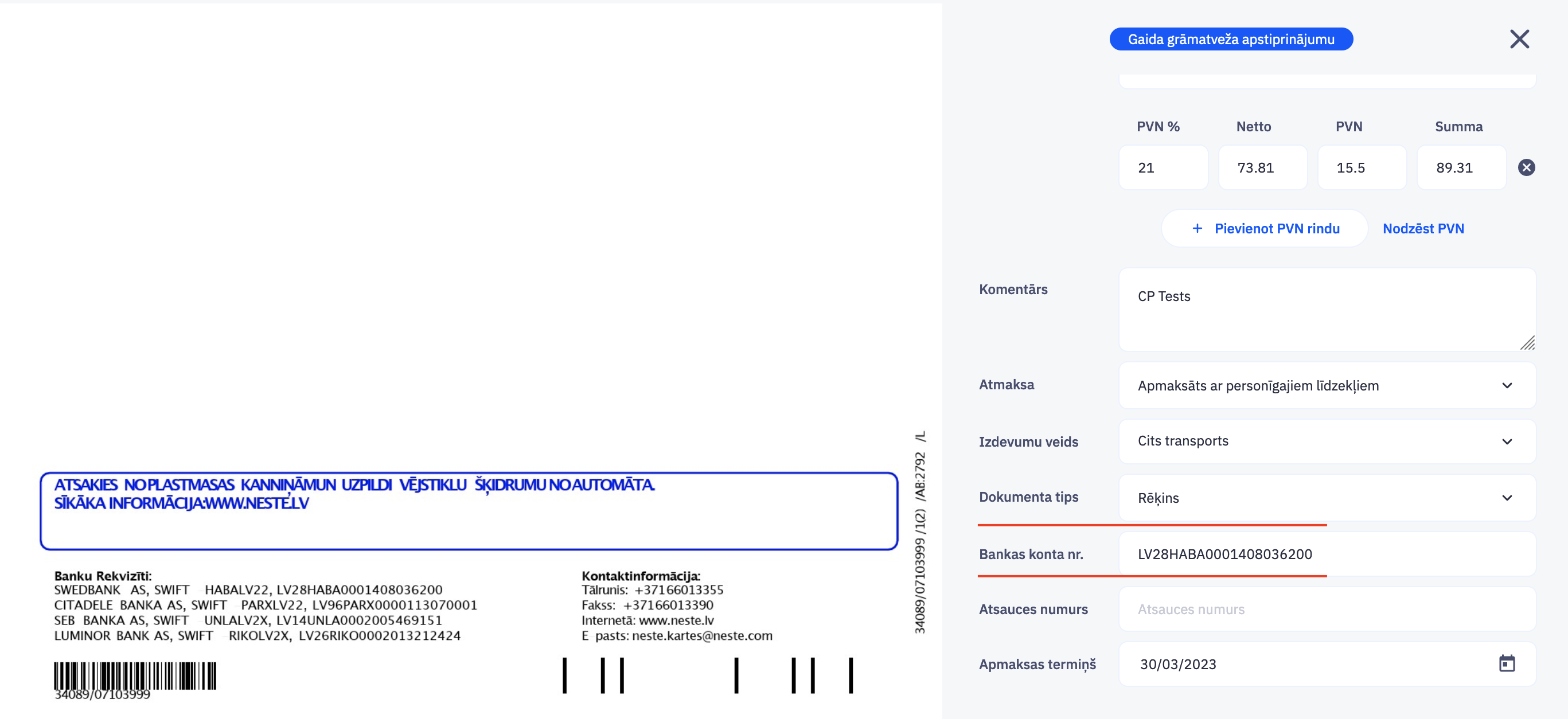 2. CostPocket lietotnē jāpārbauda PDF rēķina digitalizācijas procesa rezultātu. Jābūt: