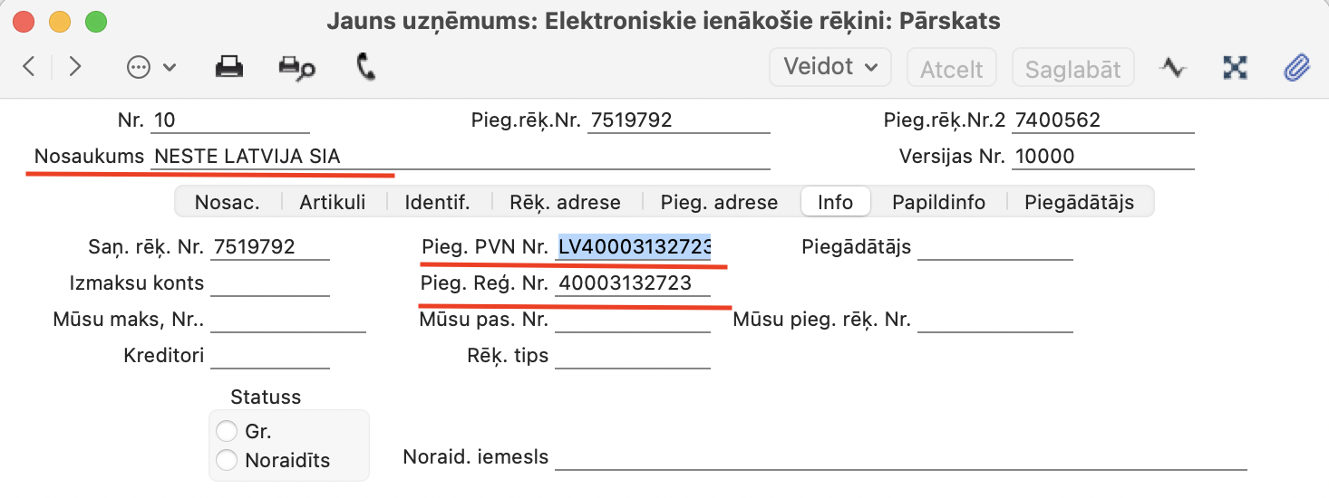 - sadaļā “Info” jābūt piegādātāja Reģistrācijas un PVN numuram