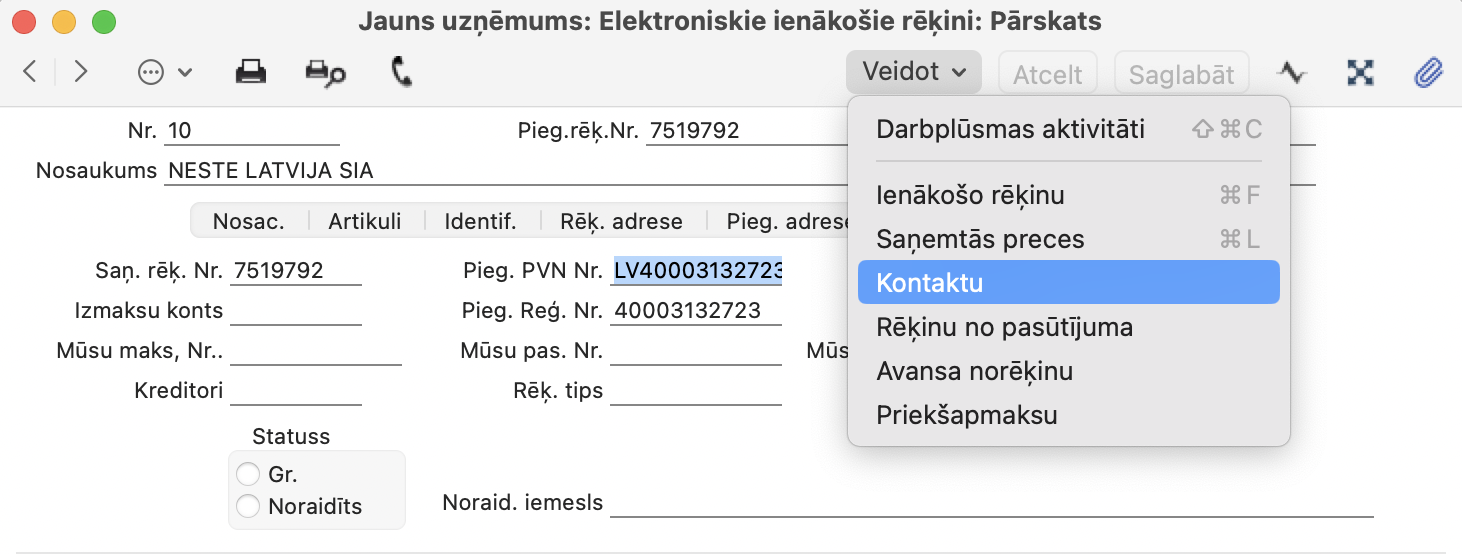 5. Izmantojot Operācijas izvēlni Veidot > Kontaktu