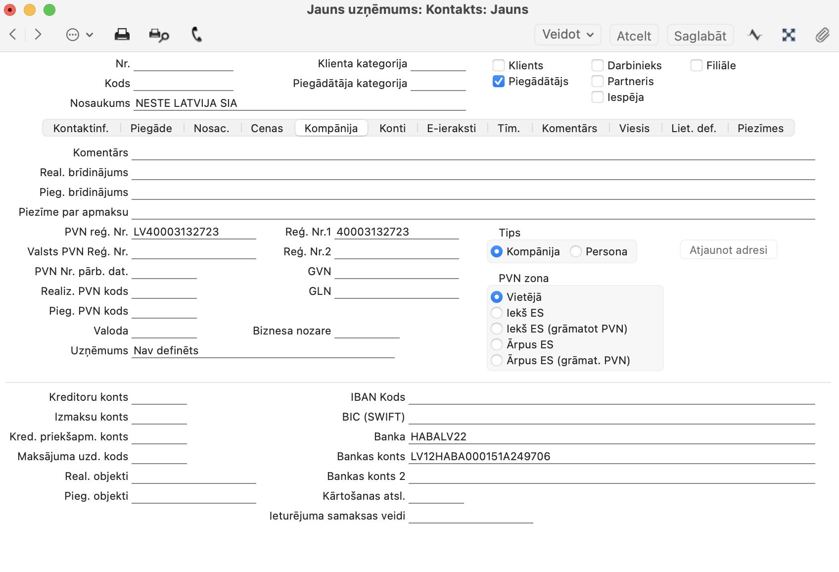 6. Programma izveidos jaunu Kontakta kartīti piegādātājam, automātiski ievietojot informāciju sadaļā “Kompānija”: