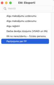 Lai izveidotu atskaiti par par fiziskām personām izmaksātajām summām, dodieties uz moduli Algas > Rutīnas > Eksports > Paziņojums par FP.