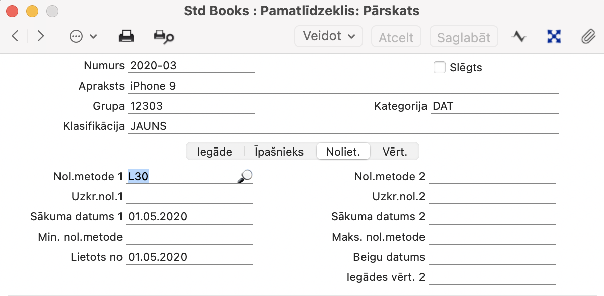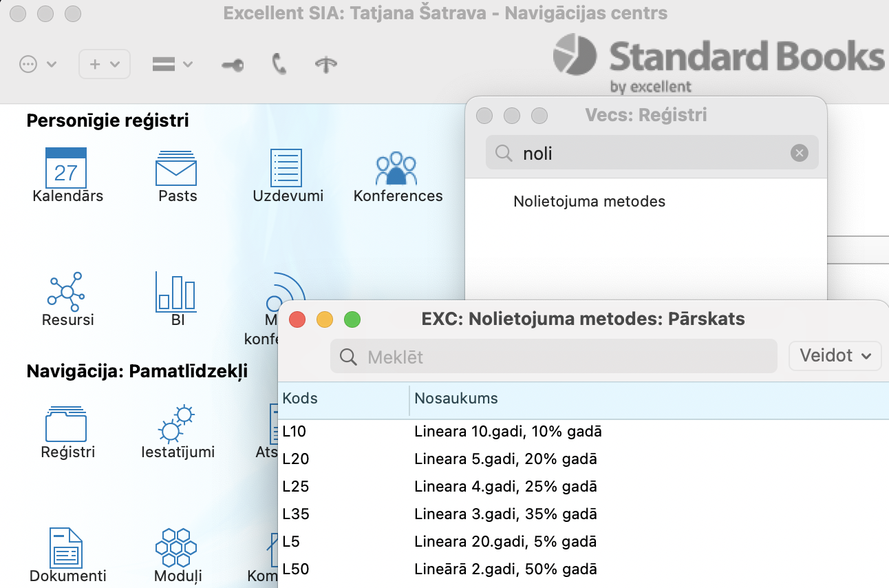 Pamatlīdzekļi > Reģistri > Nolietojuma metodes