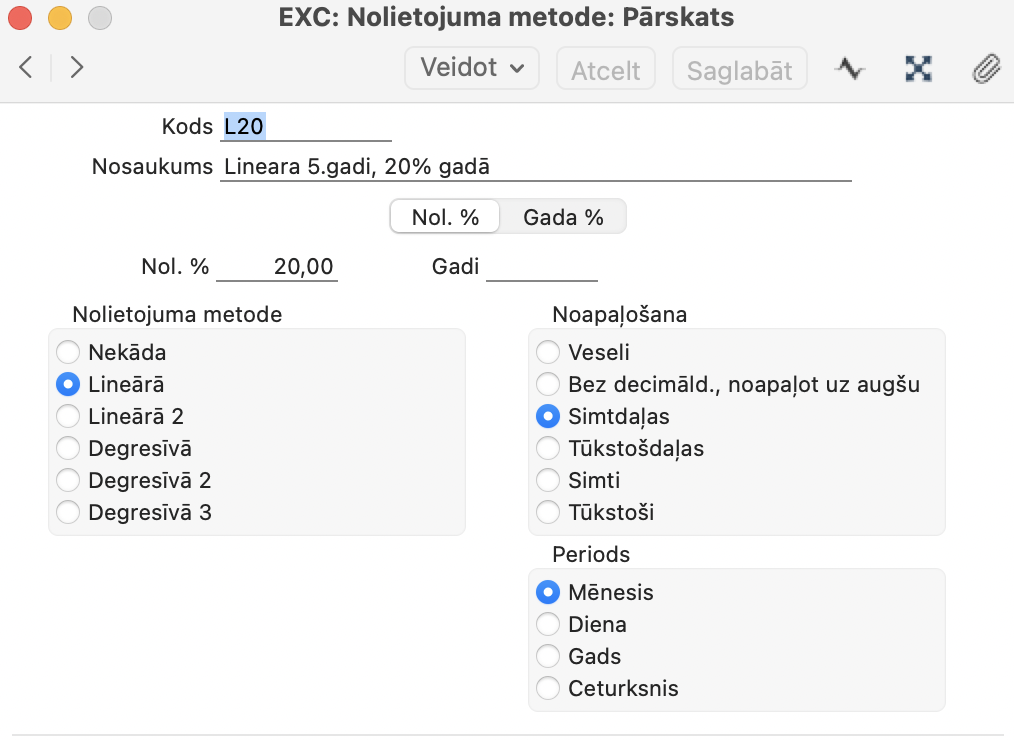 Periods – šī izvēle ir nepieciešama tikai amortizācijas modeļiem, kas izmanto Lineāro metodi. Degresīvās metodes modeļiem izvēle vienmēr ir “Mēnesis”. Šeit norādītās izvēles tiek izmantotas tikai atskaitē Pamatlīdzekļu vēsture un Nolietojuma atskaite. Citas atskaišu un apkopes gadījumā periods tiek izvēlēts tikai tad, kad tiek pasūtīta atskaite.