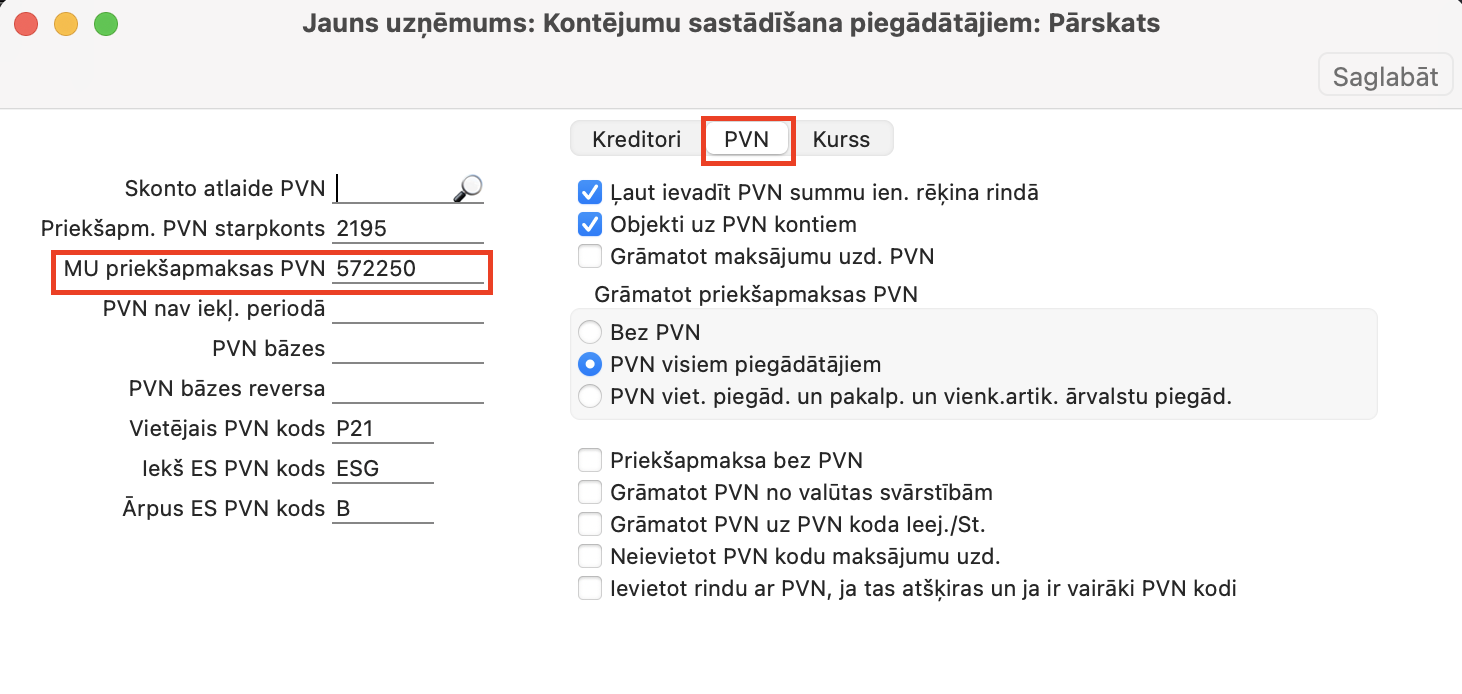 MU priekšapmaksas PVN konts – 572201 (Piegādātāji > Iestatījumi > Kontējumu sastādīšana piegādātājiem), PVN 21% priekšnodoklis konts – 572201(Finanses>Iestatījumi >PVN kodi > P21) -> NEpareizi