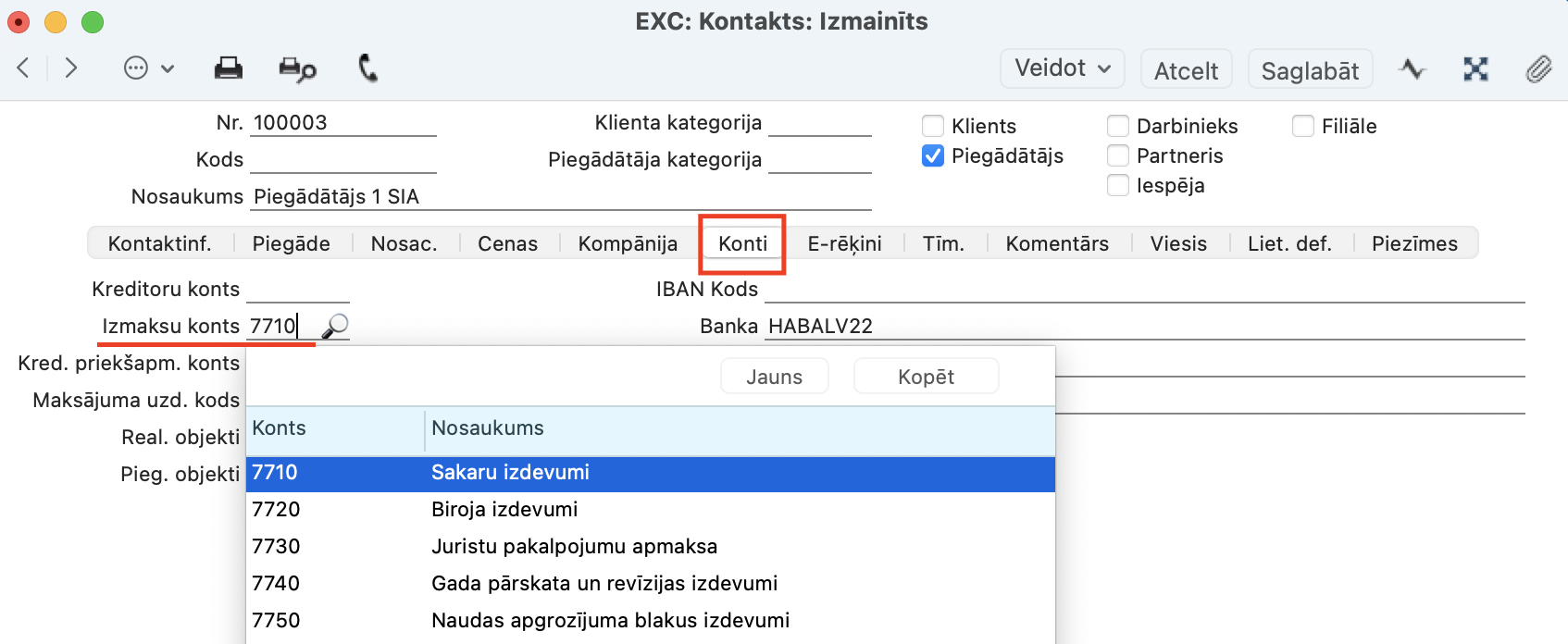 Ja vēlaties iestatīt piegādātājam pēc noklusējuma izmantojamo izmaksu kontu, tad ievadiet to ejot uz moduli Piegādātāji > Reģistri > Kontakti – piegādātāja kontaktu kartītē sadaļā “Konti”.