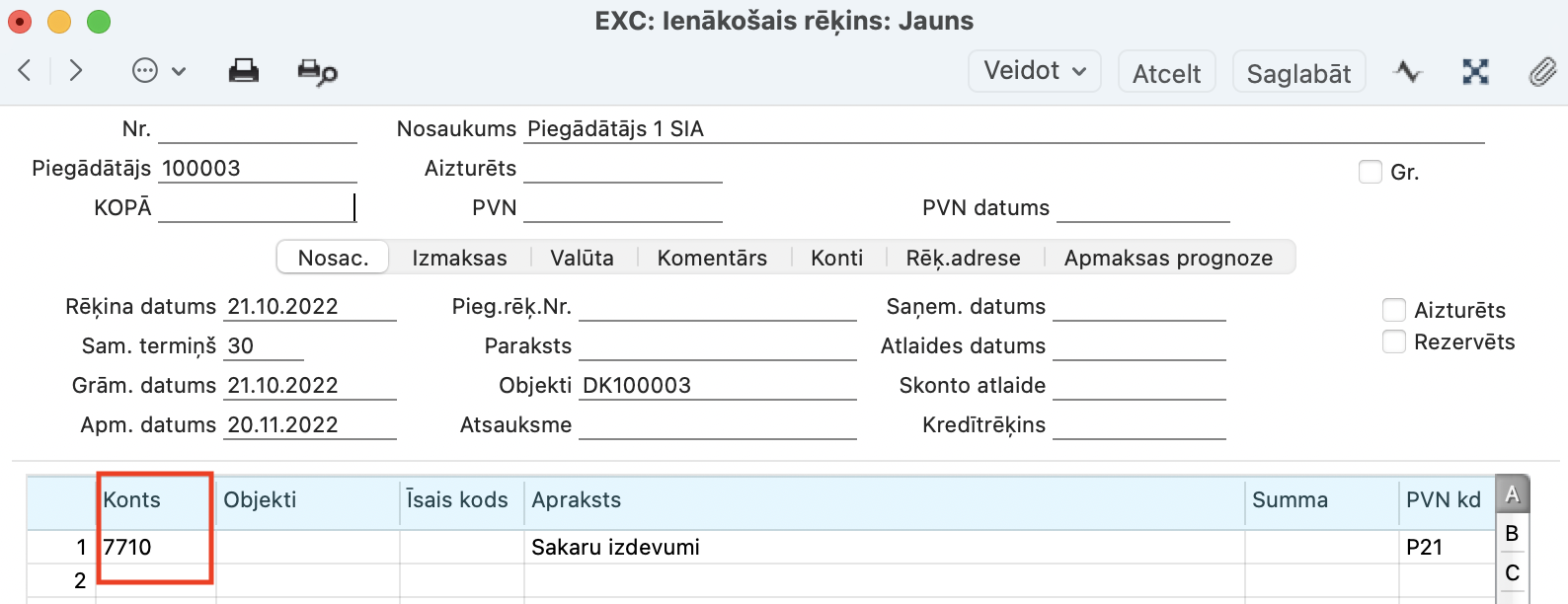 Tad veidojot Piegādātāji > Reģistri > Ienākošie rēķini > jaunu Ienākošo rēķinu, izmaksas konts parādīsies automātiski tiklīdz tiks aizpildīts piegādātāja numura lauks.