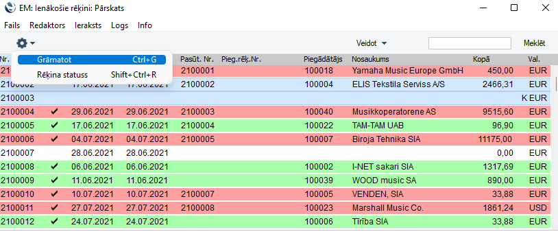 Atveriet ienākošo rēķinu reģistru, atzīmējiet ienākošo rēķinu diapazonu, turot nospiestu taustiņu Shift (izvēlētie rēķini ir redzami zilā krāsā), un Darbību izvēlnē “Zobratā” izvēlieties “Grāmatot”.