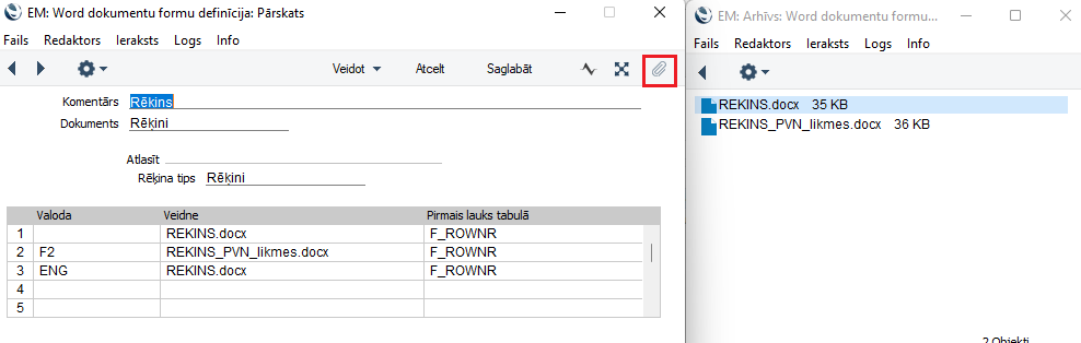 1. Atveriet jums vajadzīgo formu, kur vēlaties logotipu ievietot, ejot uz modeli Sistēma > Word dokumentu formu definīcijas > izvēlieties formu un atveriet pielikumu zem saspraudes zīmes.