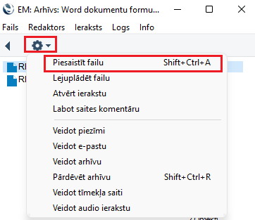 2. Ar dubultklikšķi nospiežot uz esošās formas lejuplādējiet vajadzīgo Word formu uz jūsu datora, aizvietojiet esošo Excellent logotipu ar jūsu uzņēmuma logo un saglabājiet. Pievienojiet izmainīto dokumentu no jūsu datora ar darbību ”vilkt un nomest” vai nospiežot uz Zobrata darbības izvēlni “Piesaistīt failu”.